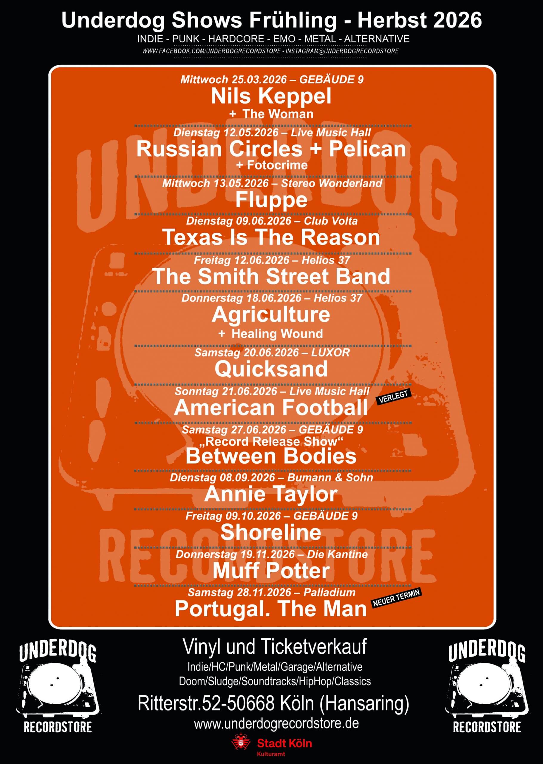 Was als kleiner Hardcore/Punk-Laden startete, hat sich nach 20 Jahren zum Garanten für eine exquisite Auswahl an Gitarrenmusik aus den Genres Indie, Hardcore, Metal, Punk in Köln entwickelt. Beeindruckend ist vor allem auch das Backprogramm, dass neben den wöchentlichen Neuheiten bis in’s Detail gepflegt wird. Durch die eigene Liebe zur Musik und die Vielseitigkeit als Plattenladen, Plattenlabel und Konzertveranstalter haben es Lars Hoffmann und seine Mitarbeiter über die Jahre hinweg geschafft, glaubwürdig und integer zu bleiben, und dadurch eine enge Kundennähe geschaffen. Denn nur aus einer bestimmten Überzeugung heraus konnten Musikbusiness-Krise und illegalen Downloads tapfer getrotzt werden: Wirkliche Plattenladenatmosphäre kann man nicht downloaden – die Kundschaft des Underdog Recordstore weiß das!